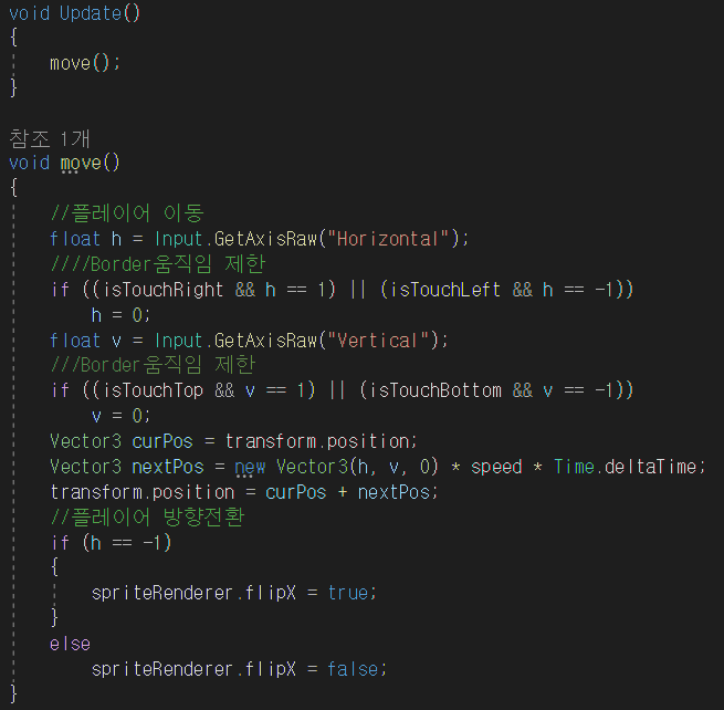 위 if문에 걸리지 않는다면 현재위치 curPos 에 nextPos를 더해주어 플레이어를 이동시킨다. 이 때 Time.deltaTime을 곱해주어야 컴퓨터 성능간에 플레이 차이가 발생하지 않는다.