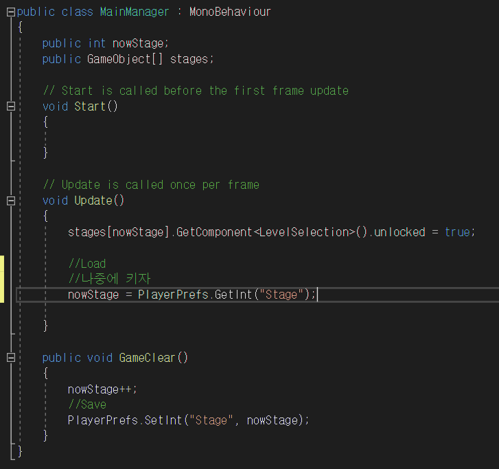 또한 GameClear()함수를 통해 해당 맵에서 게임을 클리어 하면 nowStage를 1 증가시켜 저장하는 함수를 간단하게 작성하였다.