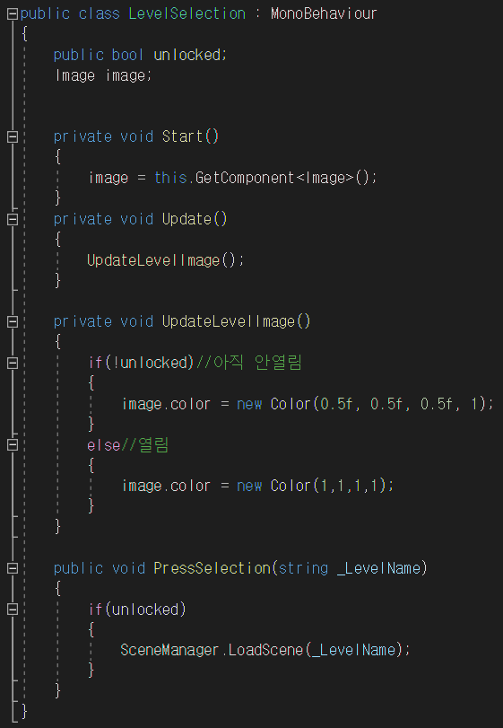 코드는 다음과 같다 bool형 변수 unlocked를 통해 image의 A값을 제어한다.