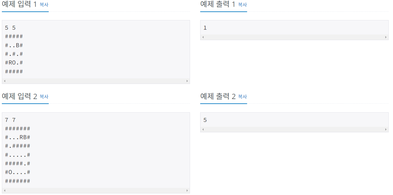 보드의 세로 크기는 N, 가로 크기는 M이고, 편의상 1×1크기의 칸으로 나누어져 있다. 가장 바깥 행과 열은 모두 막혀져 있고, 보드에는 구멍이 하나 있다. 빨간 구슬과 파란 구슬의 크기는 보드에서 1×1크기의 칸을 가득 채우는 사이즈이고, 각각 하나씩 들어가 있다. 게임의 목표는 빨간 구슬을 구멍을 통해서 빼내는 것이다. 이때, 파란 구슬이 구멍에 들어가면 안 된다.