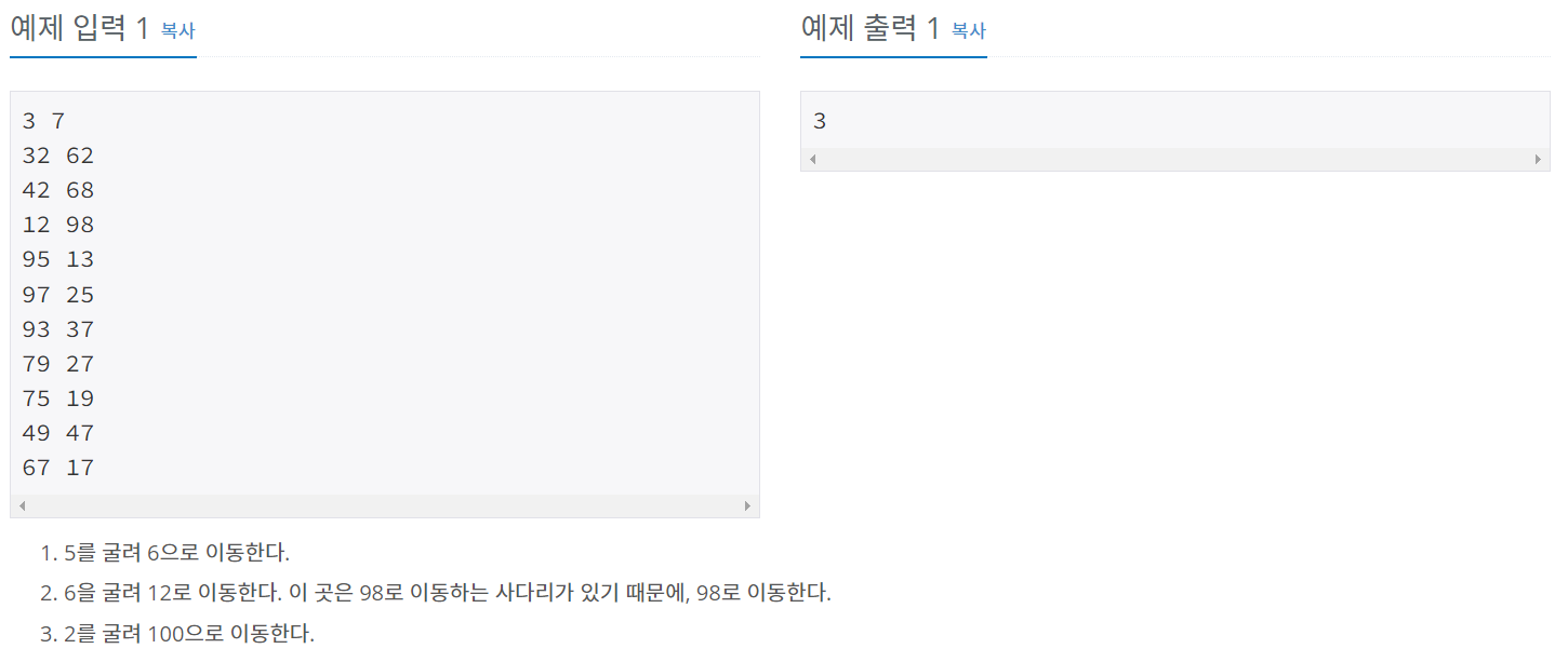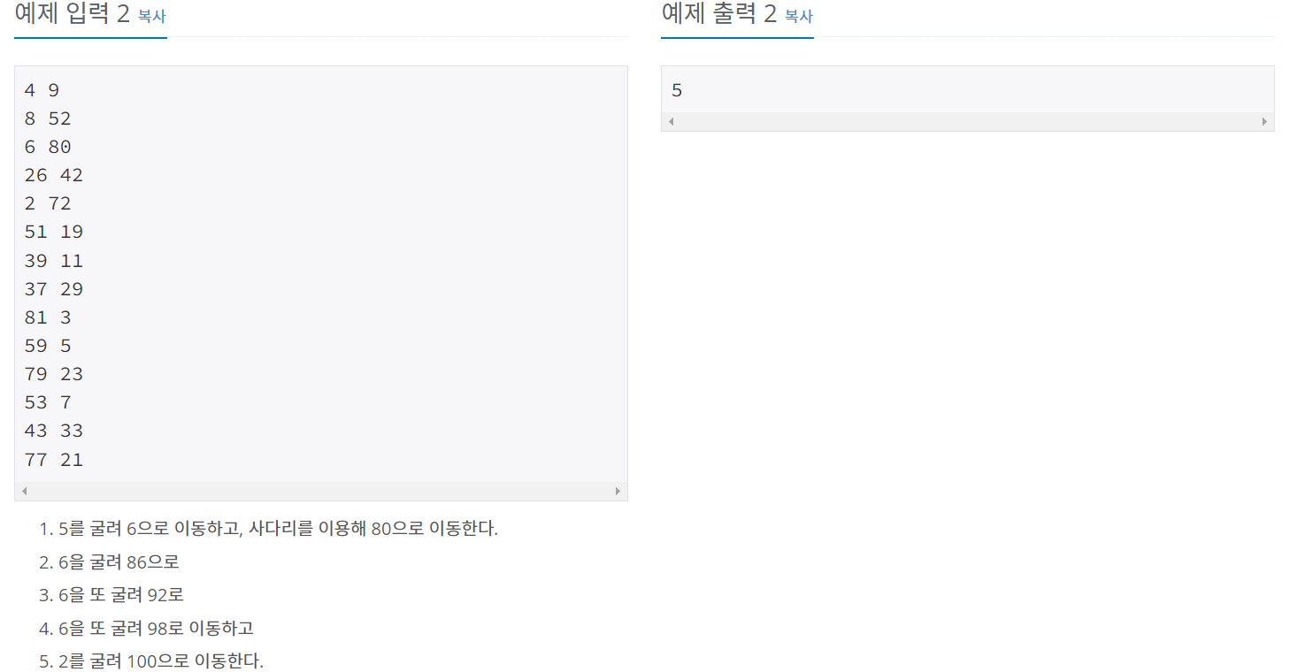 1번 칸과 100번 칸은 뱀과 사다리의 시작 또는 끝이 아니다. 모든 칸은 최대 하나의 사다리 또는 뱀을 가지고 있으며, 동시에 두 가지를 모두 가지고 있는 경우는 없다. 항상 100번 칸에 도착할 수 있는 입력만 주어진다.