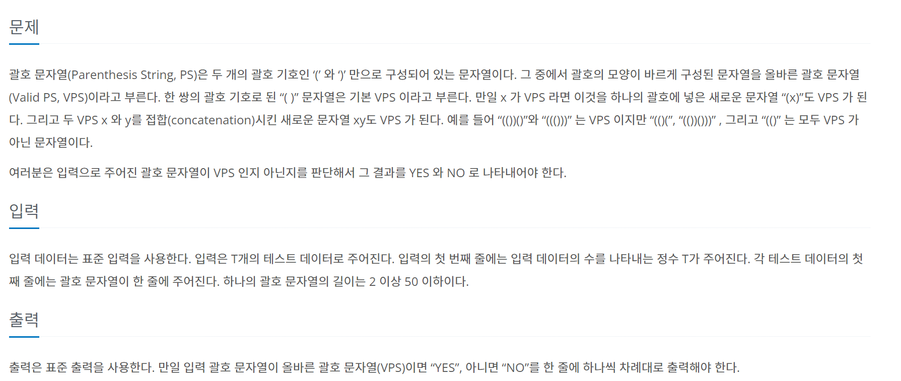 괄호 문자열(Parenthesis String, PS)은 두 개의 괄호 기호인 ‘(’ 와 ‘)’ 만으로 구성되어 있는 문자열이다. 그 중에서 괄호의 모양이 바르게 구성된 문자열을 올바른 괄호 문자열(Valid PS, VPS)이라고