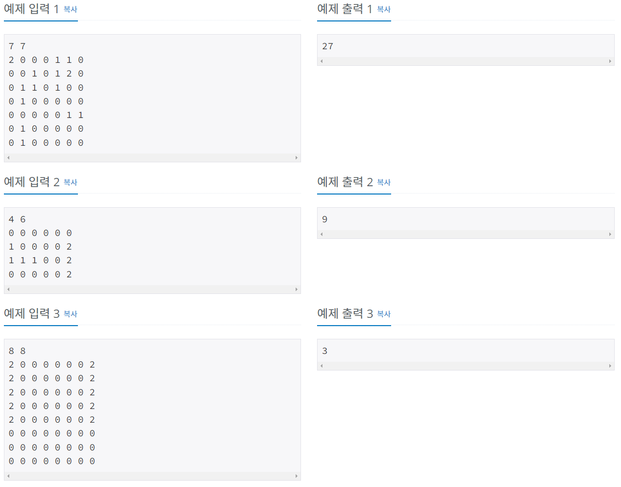연구소는 크기가 N×M인 직사각형으로 나타낼 수 있으며, 직사각형은 1×1 크기의 정사각형으로 나누어져 있다. 연구소는 빈 칸, 벽으로 이루어져 있으며, 벽은 칸 하나를 가득 차지한다.