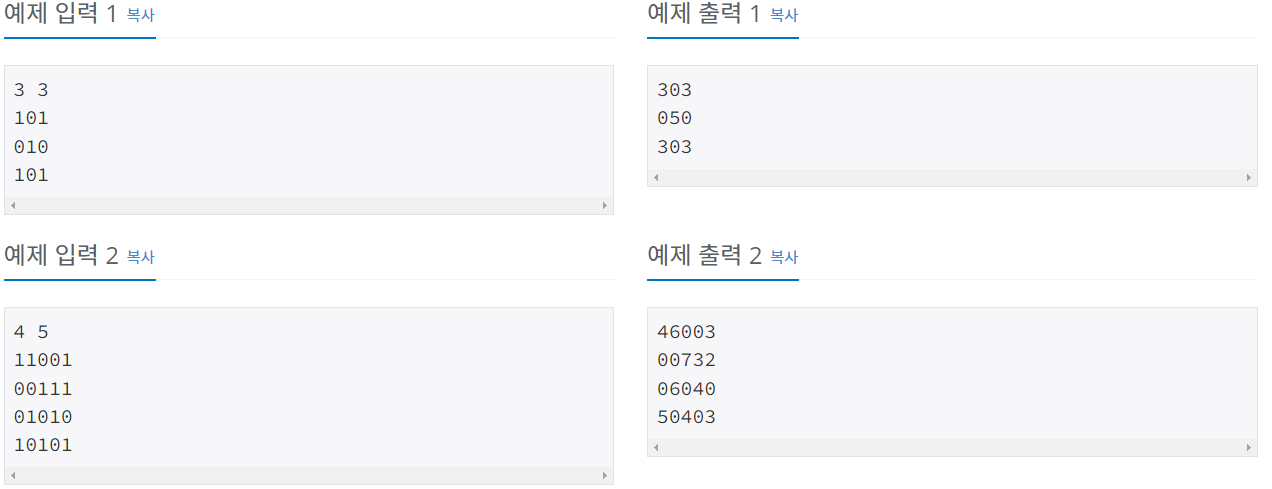 첫째 줄에 N(1 ≤ N ≤ 1,000), M(1 ≤ M ≤ 1,000)이 주어진다. 다음 N개의 줄에 M개의 숫자로 맵이 주어진다.