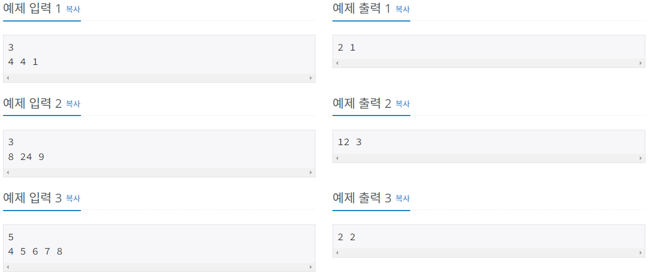첫째 줄에 상근이가 얻을 수 있는 가장 큰 점수와 최소 몇 번 만에 그 점수를 얻을 수 있는지를 출력한다.