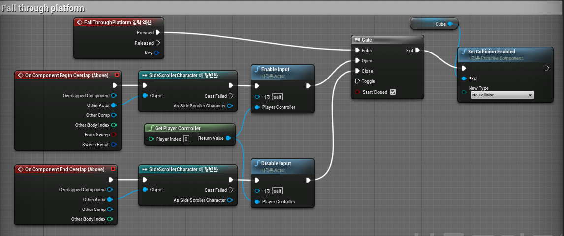 코드를 살펴보자면 점프를 시작할때는 no collision을 적용해서 점프했을 때는 바닥을 지나가고, 점프까 끝날때는 콜리전을 활성화해서 점프가 끝났을 때는 그 바닥위에 올라가도록 하였다.
