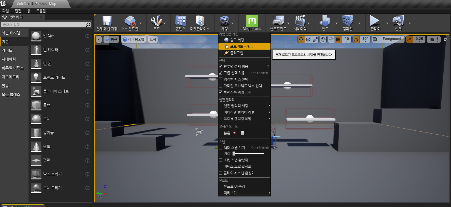 다음으로 아래키를 눌렀을 때 바닥을 내려오도록 설정해보자. 먼저 아래키를 등록하기위해 세팅->프로젝트세팅->엔진->입력->액션매핑에 아래키를 등록하고 이름은 FallThroughPlatform으로 등록하자