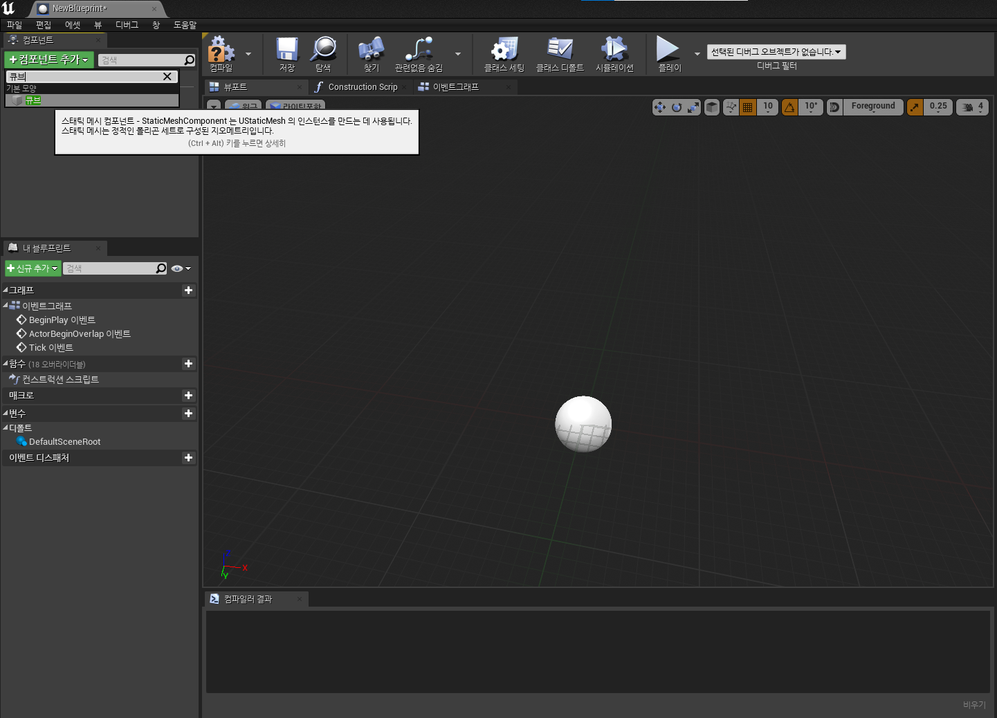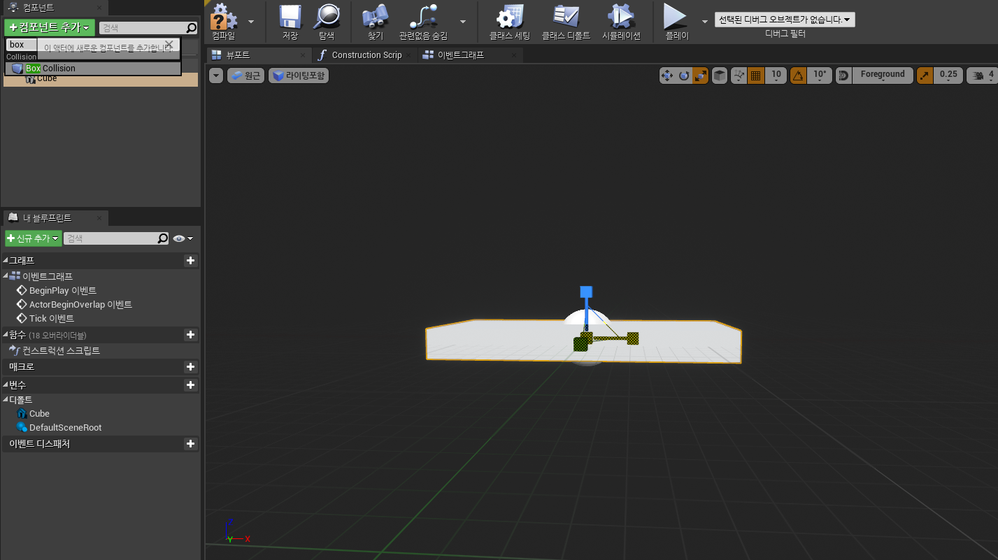 생성한 블루프린트에 들어가서 왼쪽 상단의 컴포터는 추가 ->"큐브" 입력하여 큐브를 하나 생성한다.