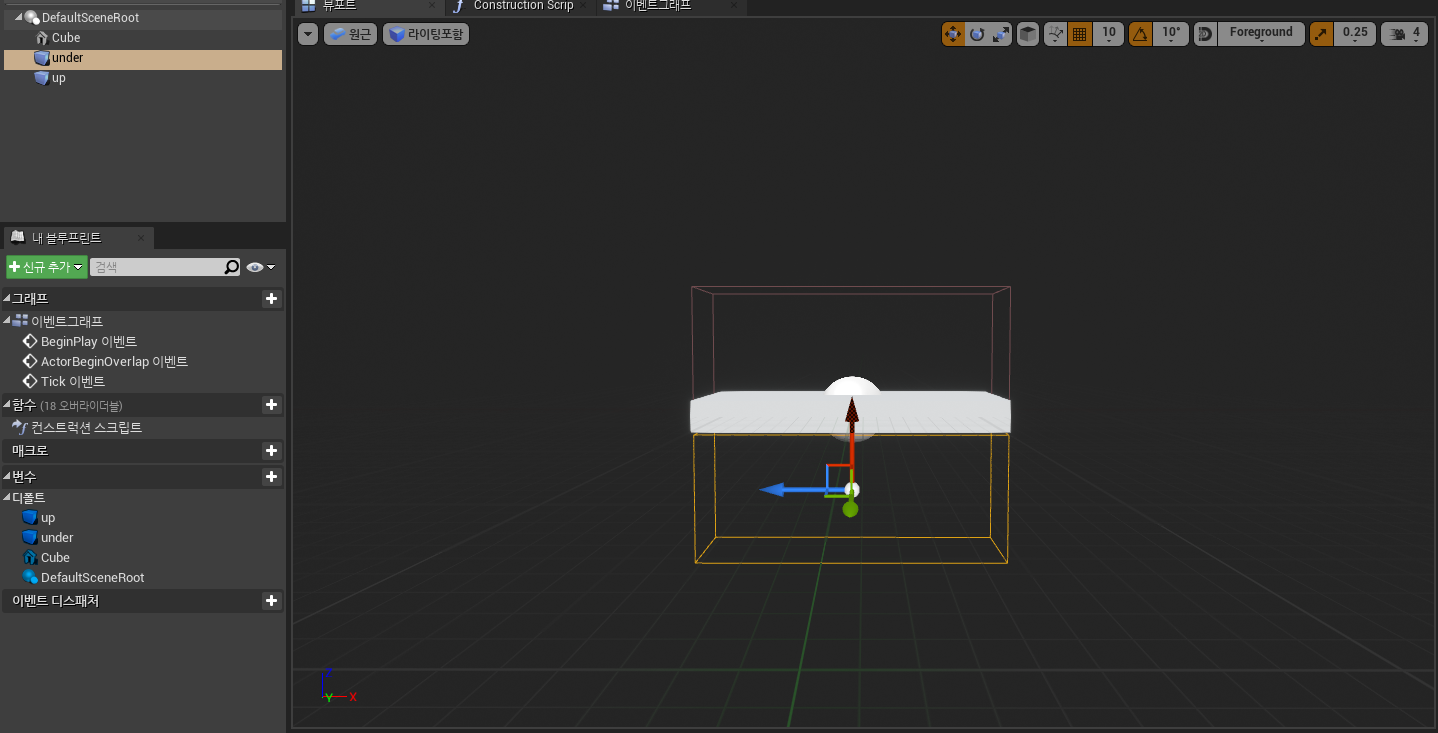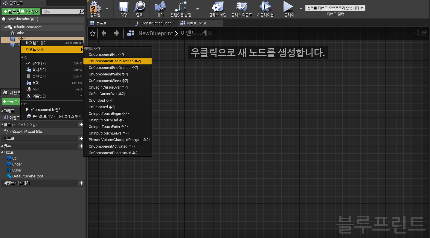 이벤트그래프에서는 방금 생성한 under를 우클릭해서 OnComponentBeginOverlap과 OnComponentEndOverlap을 추가한다.