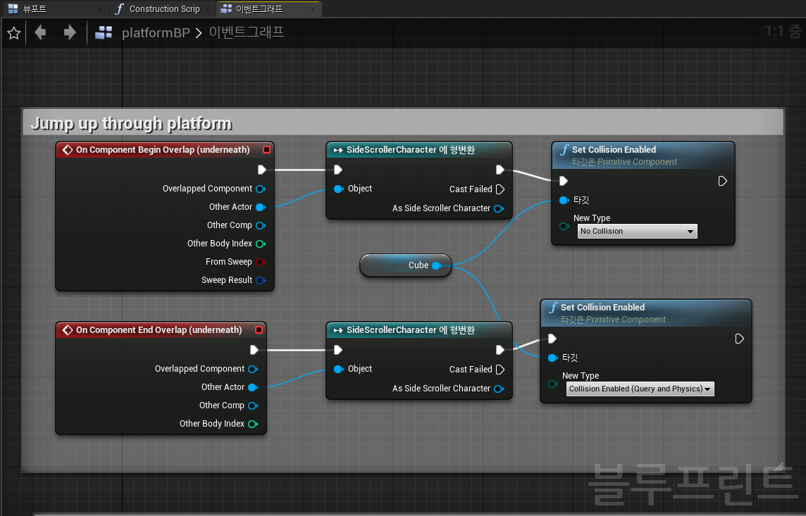 코드를 살펴보자면 점프를 시작할때는 no collision을 적용해서 점프했을 때는 바닥을 지나가고, 점프까 끝날때는 콜리전을 활성화해서 점프가 끝났을 때는 그 바닥위에 올라가도록 하였다.