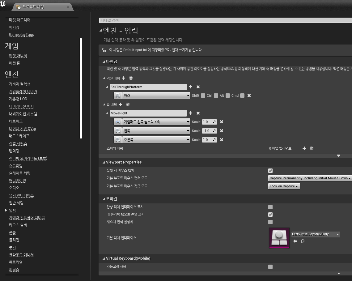 다음으로 아래키를 눌렀을 때 바닥을 내려오도록 설정해보자. 먼저 아래키를 등록하기위해 세팅->프로젝트세팅->엔진->입력->액션매핑에 아래키를 등록하고 이름은 FallThroughPlatform으로 등록하자