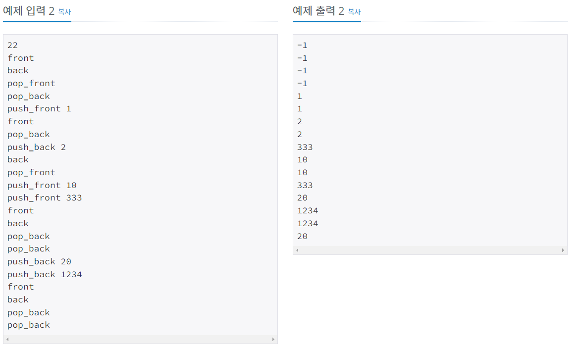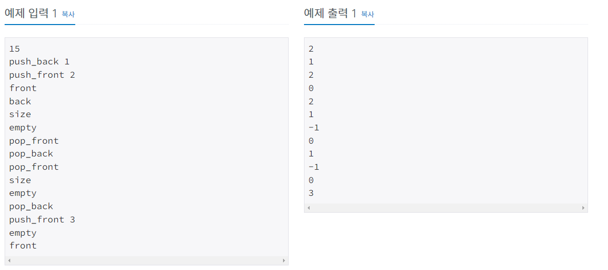정수를 저장하는 덱(Deque)를 구현한 다음, 입력으로 주어지는 명령을 처리하는 프로그램을 작성하시오.
