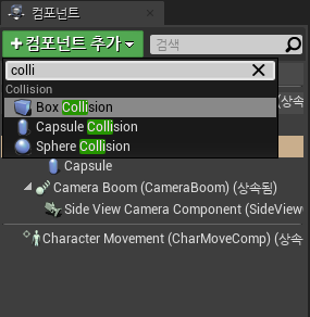 다시 캐릭터 블루프린트로 돌아와서 기본 콜리전 값을 No collision으로 해주고