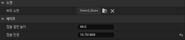 이때 캡슐 콜리전의 디테일 패널에서 부모 메시에 따라다닐 소켓을 지정해주고 Shape를 칼에 맞게 지정해준다