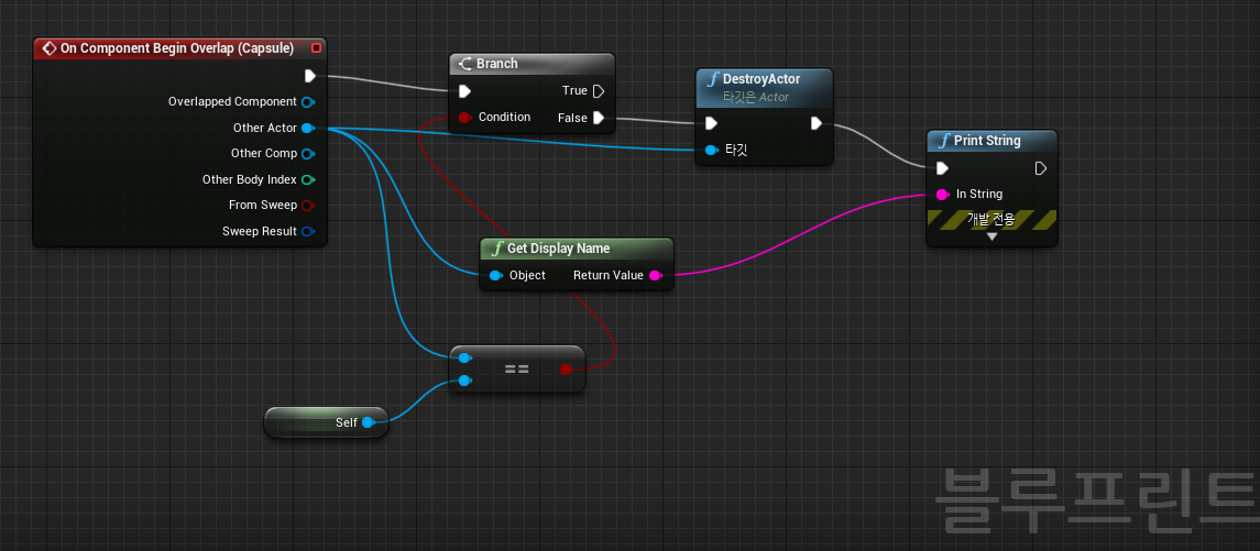 그리고 블루프린트에서 자신이 아닌 다른 콜리전이 있는 오브젝트와 닿았을 시 해당 오브젝트를 파괴하도록 코드를 짠다
