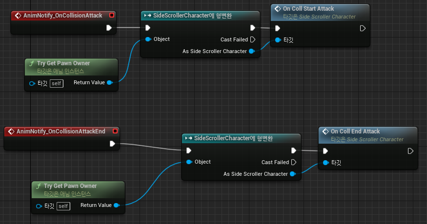 노드를 연결해서 애니메이션의 OnCollStartAttack 부분에 닿으면 콜리전을 켜주고