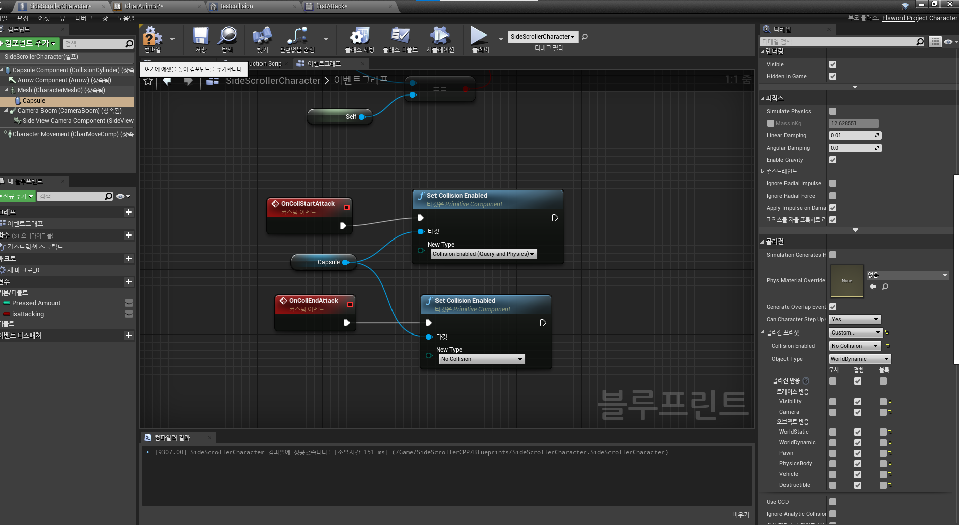 캐릭터 블루프린트에서 [커스텀 이벤트 추가] -> OnCollStartAttack과OnCollEndAttack을 만들어준다