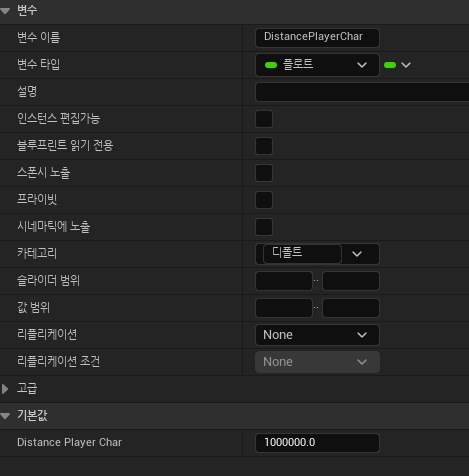 먼저 몬스터 블루프린트로 들어가서 DistancePlayerChar라는 변수를 하나 만들어준다