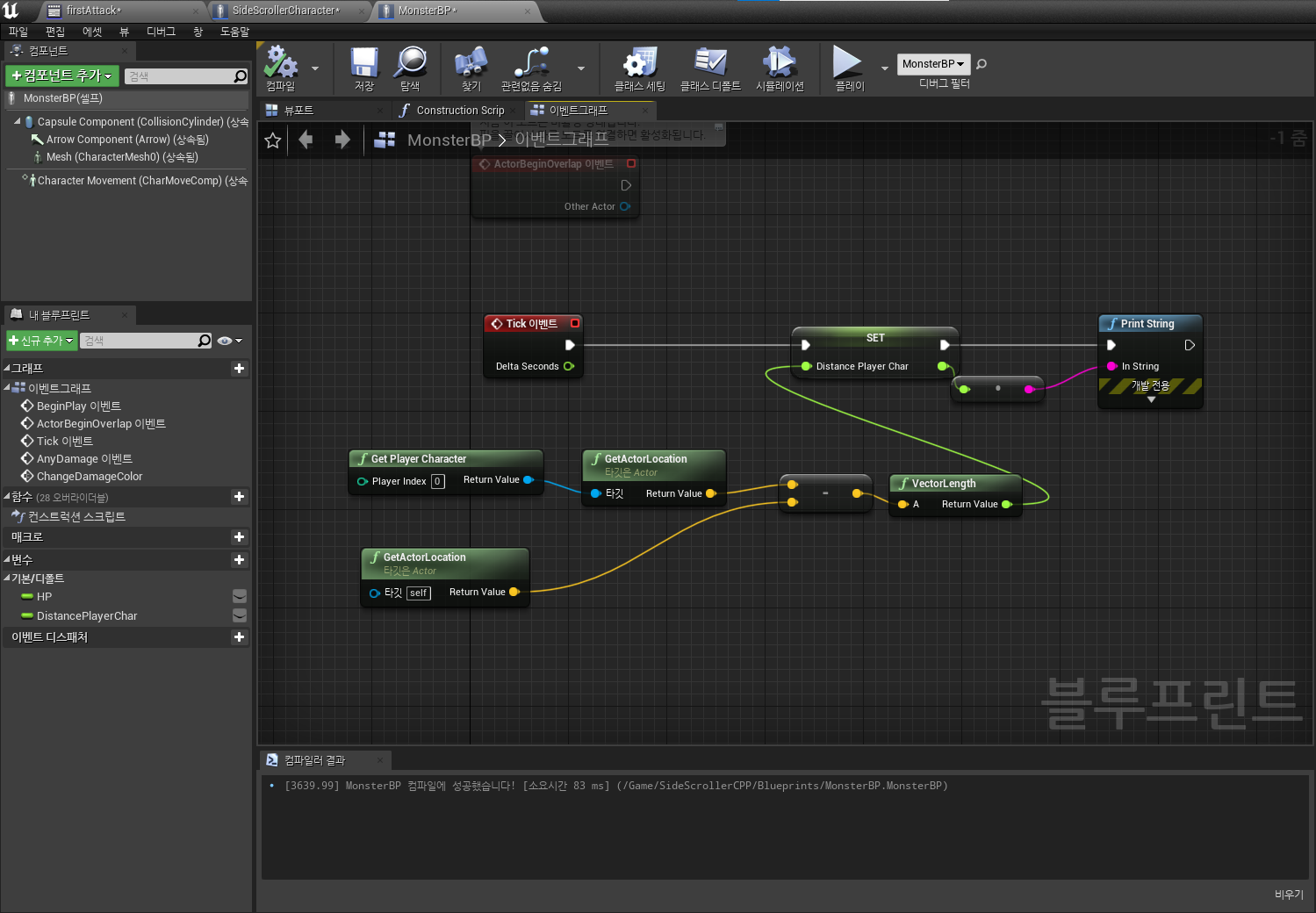 그런 다음 캐릭터와 몬스터의 거리값의 차를 DistancePlayerChar로 저장하도록 변수에 연결해주고 그 값을 string으로 출력되도록 연결해보면 다음과 같이 출력된다