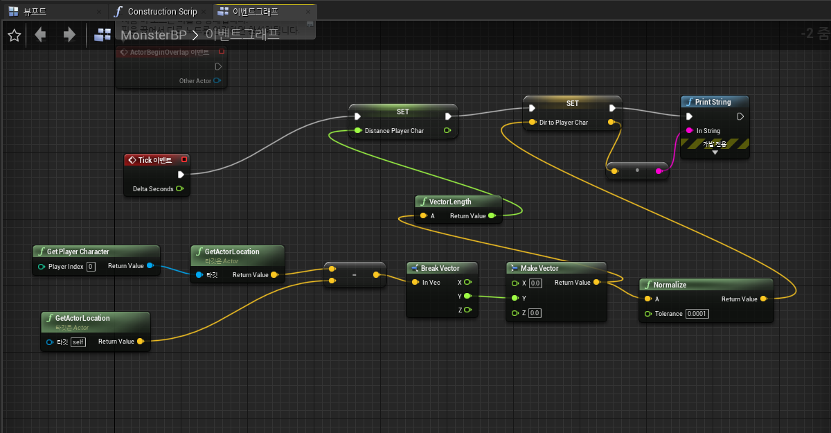 몬스터 블루프린트에서 tick이벤트 자리에 새로운 이벤트로 SaveDisAndDir 이벤트를 만들어서 교체하고