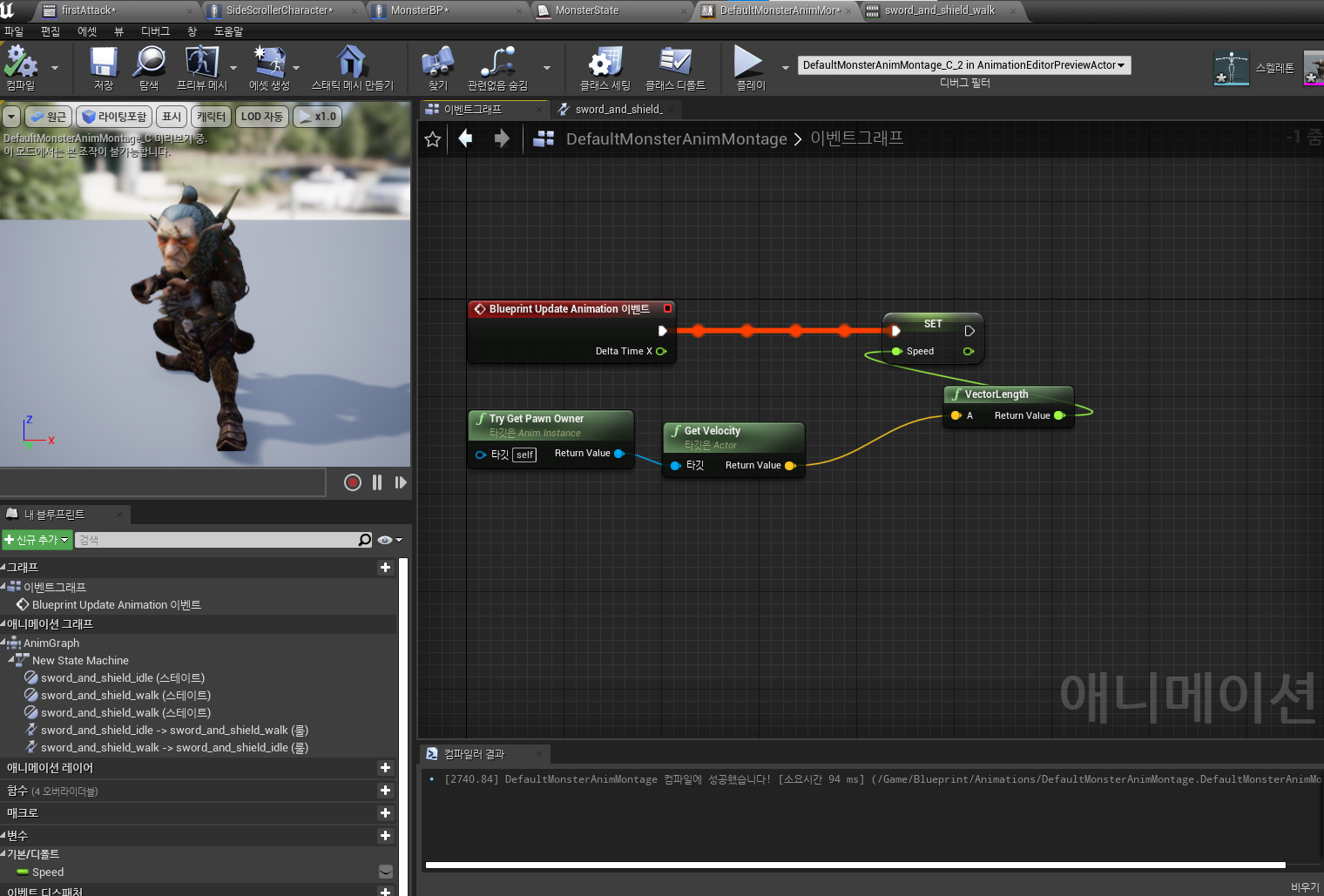 몬스터 블루프린트로 가서 Speed라는 float변수형을 하나 만들어주고 이벤트 그래프에 몬스터가 움직일 때 speed를 받아오도록 설정한다