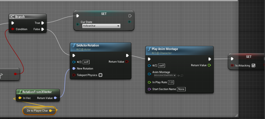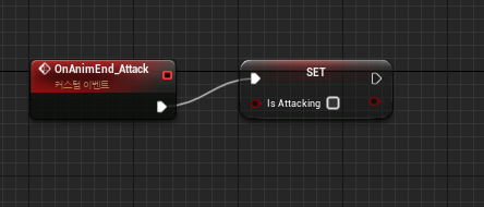 아니라면 공격 애니메이션을 실행하면서 IsAttacking 변수를 True로 바꾸어주는 것으로 노드를 연결한다