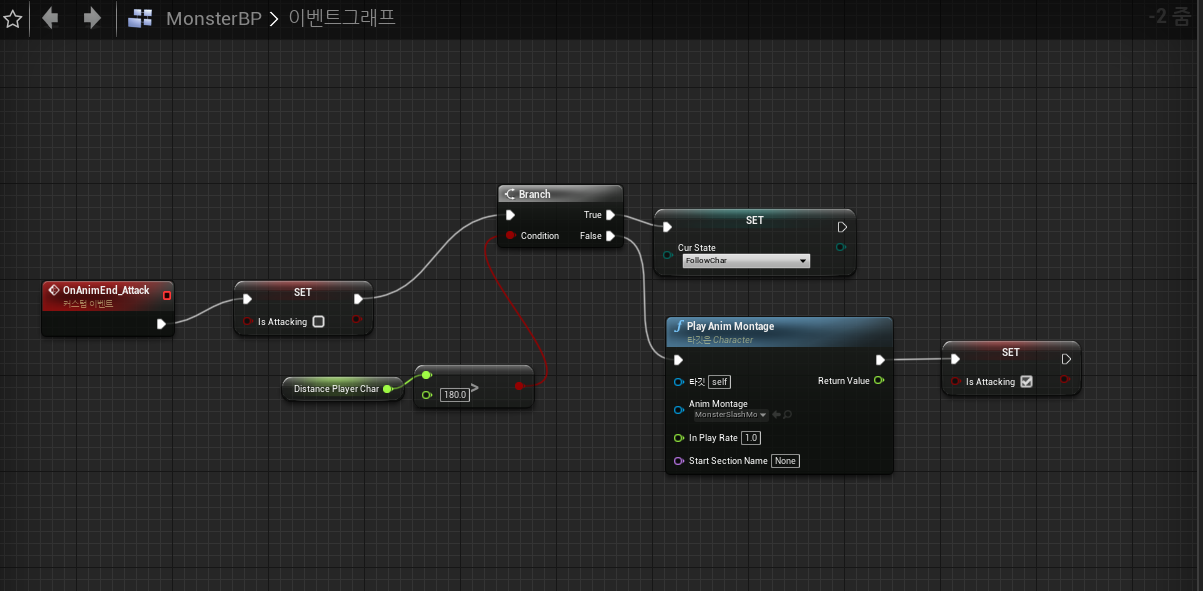 몬스터 블루프린트에서 애니메이션이 해당 노티파이에 닿으면 방금 생성한 이벤트를 발생시켜 isAttacking을 False로 만든다