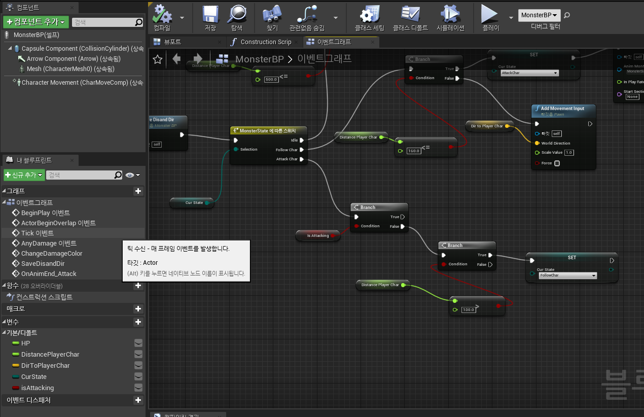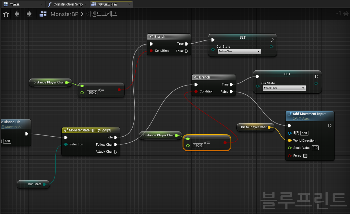 몬스터 블루프린트에서 캐릭터와 몬스터와의 거리가 160이하가 되면 Monster State변수를 AttackChar로 바뀌도록 설정한다