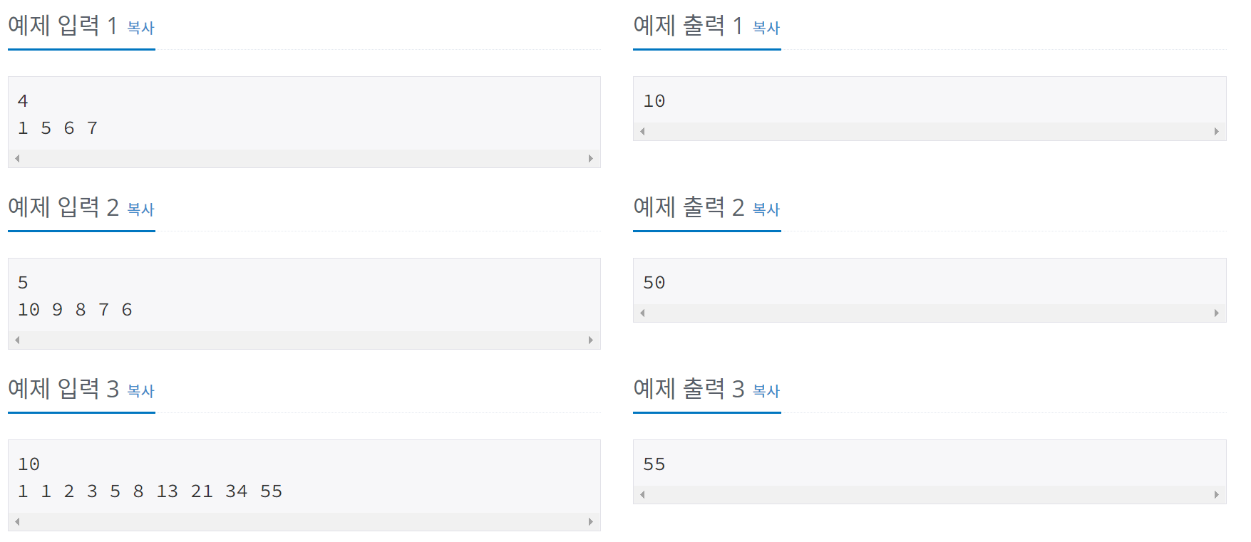 첫째 줄에 민규가 구매하려고 하는 카드의 개수 N이 주어진다. (1 ≤ N ≤ 1,000) 둘째 줄에는 Pi가 P1부터 PN까지 순서대로 주어진다. (1 ≤ Pi ≤ 10,000)