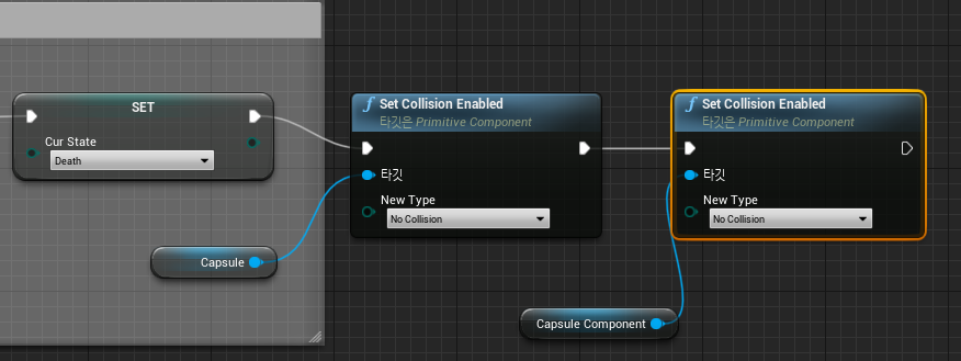 그리고 죽으면 Collision이 비활성화 되도록 연결한다.콜리전은 무기에 하나, 몬스터 본체에 하나가 있기 때문에 2개를 연결해서 No Collision상태로 만들어준다