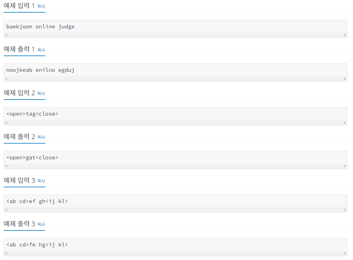 문자열 S가 주어졌을 때, 이 문자열에서 단어만 뒤집으려고 한다. 먼저, 문자열 S는 아래와과 같은 규칙을 지킨다. 알파벳 소문자('a'-'z'), 숫자('0'-'9'), 공백(' '), 특수 문자('<', '>')로만 이루어져