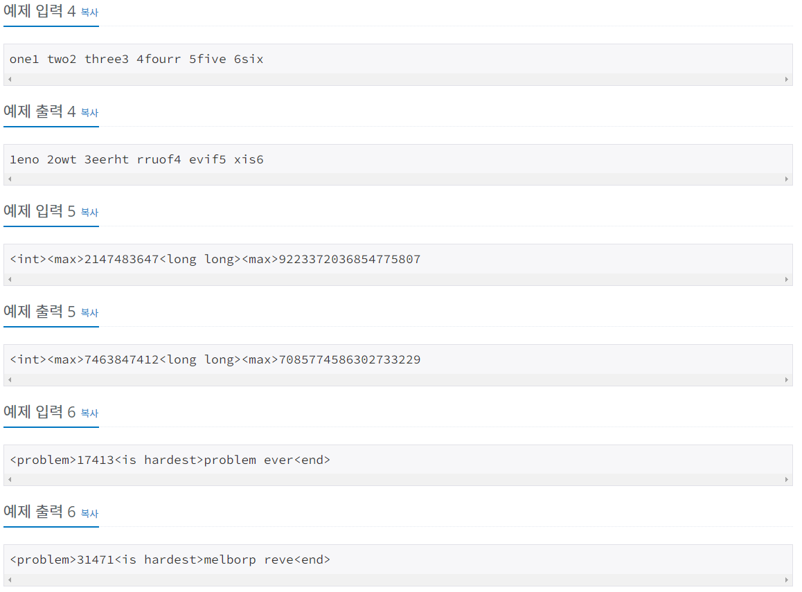 문자열 S가 주어졌을 때, 이 문자열에서 단어만 뒤집으려고 한다. 먼저, 문자열 S는 아래와과 같은 규칙을 지킨다. 알파벳 소문자('a'-'z'), 숫자('0'-'9'), 공백(' '), 특수 문자('<', '>')로만 이루어져