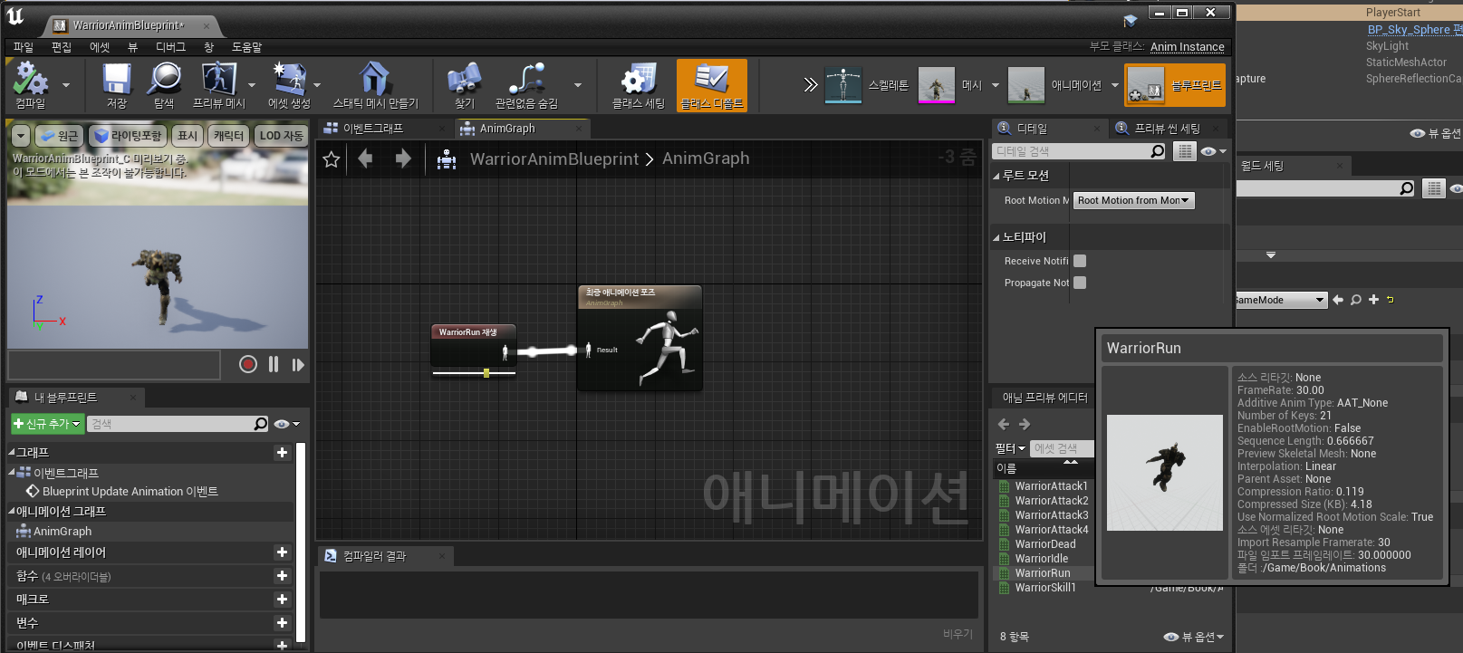 WarriorAnimBlueprint를 열고 들어가서 WarriorRun을 Result에 연결시키고 저장한다