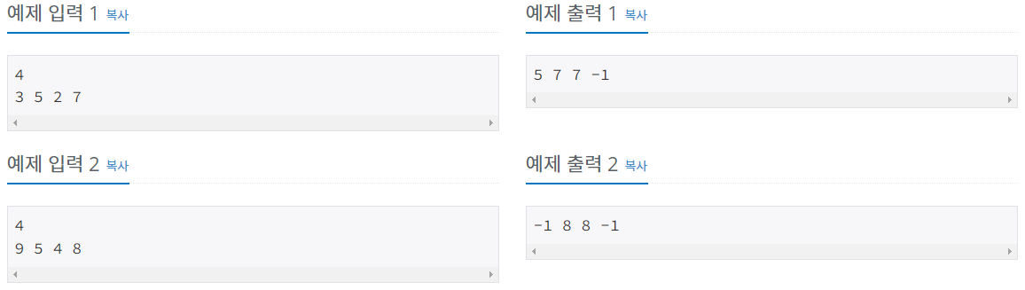 예를 들어, A = [3, 5, 2, 7]인 경우 NGE(1) = 5, NGE(2) = 7, NGE(3) = 7, NGE(4) = -1이다. A = [9, 5, 4, 8]인 경우에는 NGE(1) = -1, NGE(2) = 8, NGE(3) = 8, NGE(4) = -1이다.
