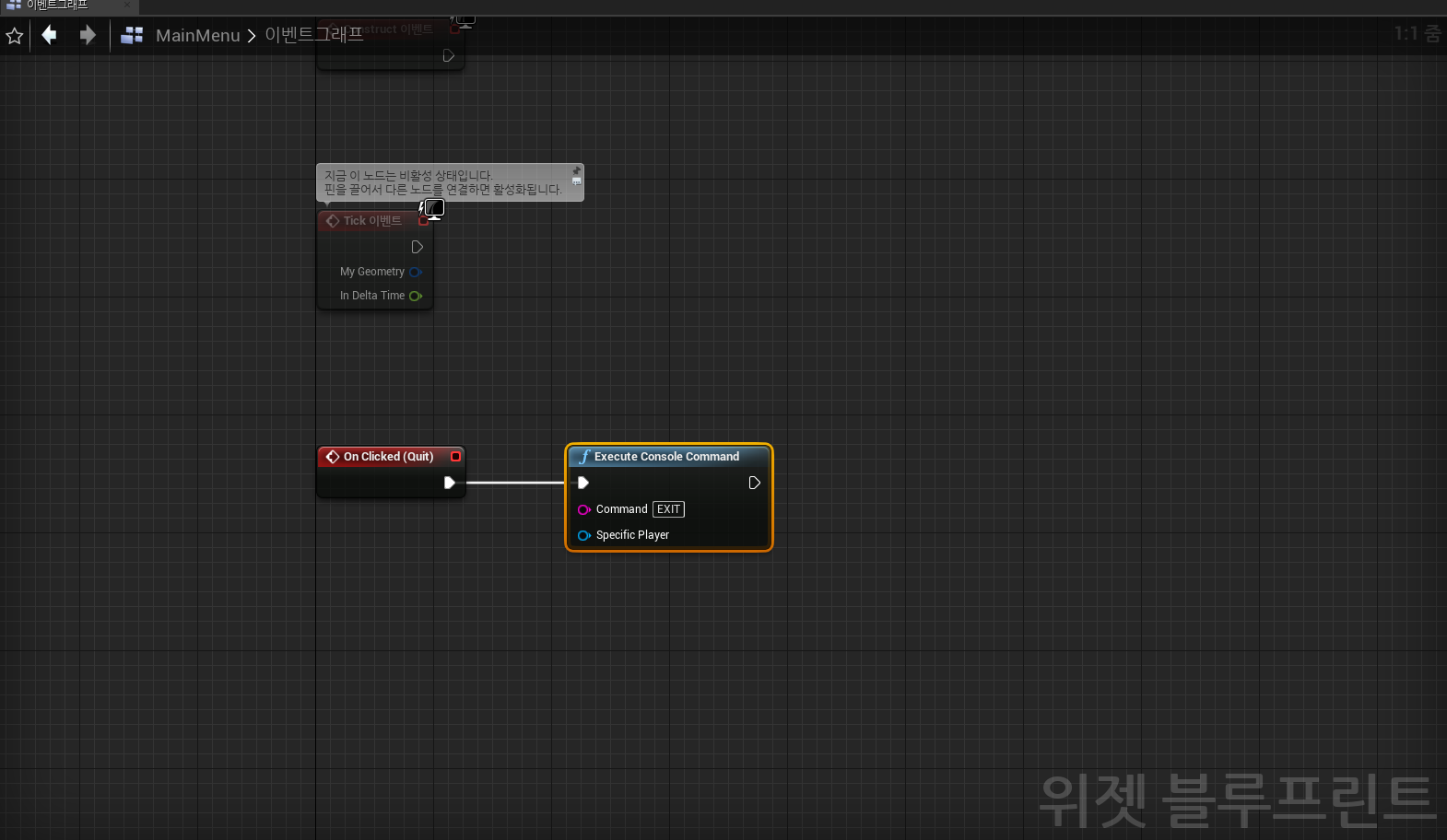 그리고 노드를 다음과 같이 연결하여 레벨이 시작하였을 때 방금 제작한 ui가 보이도록 설정한다