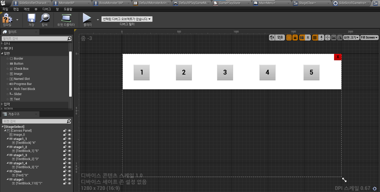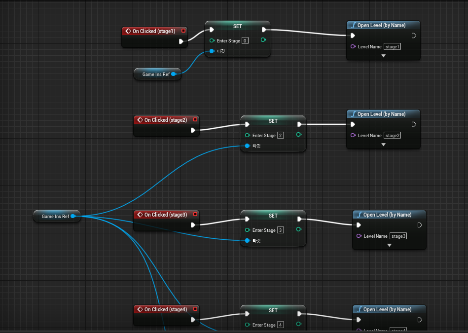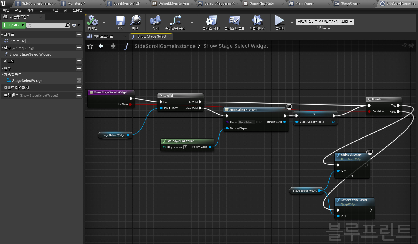 이제 이 함수를 작동하면 stage select 위젯이 켜지게 되고 반대로 함수의 작동을 멈추면 위젯은 꺼지게 된다.
