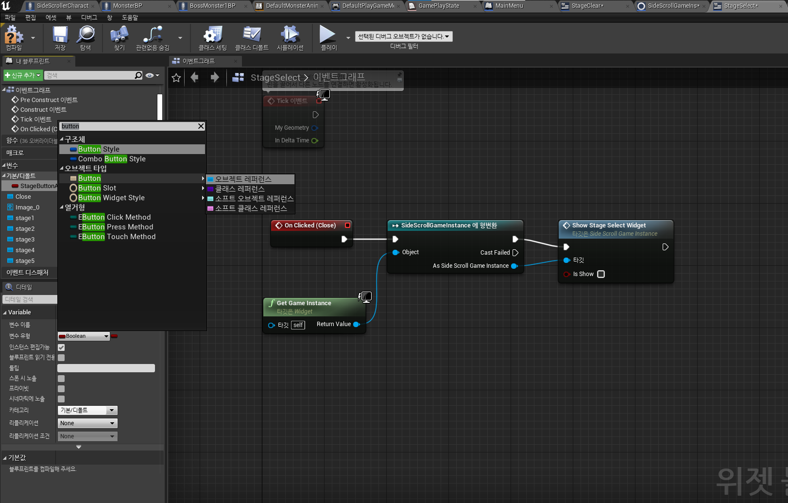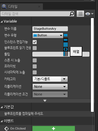 StageSelect 블루프린트에서 변수를 하나 추가하고 변수 유형은 Button->오브젝트 레퍼런스 로 설정하고