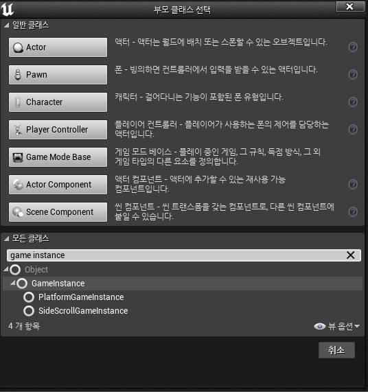 다음 블루프린트 생성 -> game instance 블루프린트를 생성하고