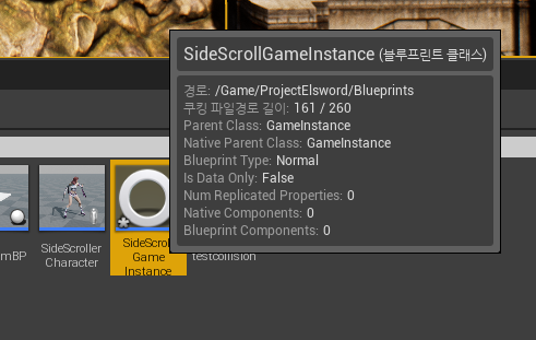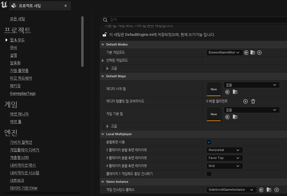 프로젝트 세팅 - 맵&모드 -게임 인스턴스 클래스 부분을 방금 만든 SideScrollGameInstance로 바꾸어준다