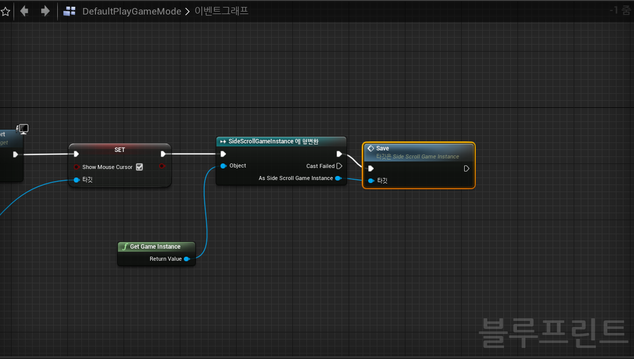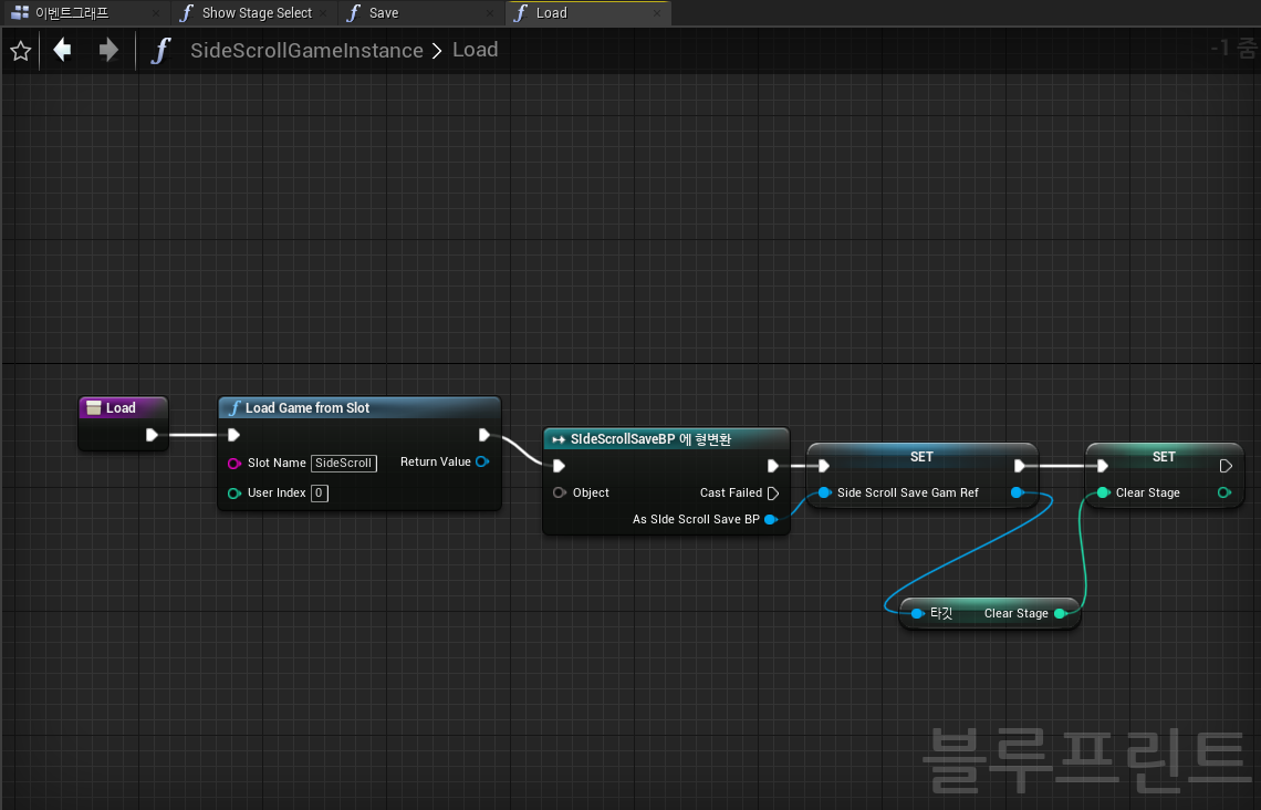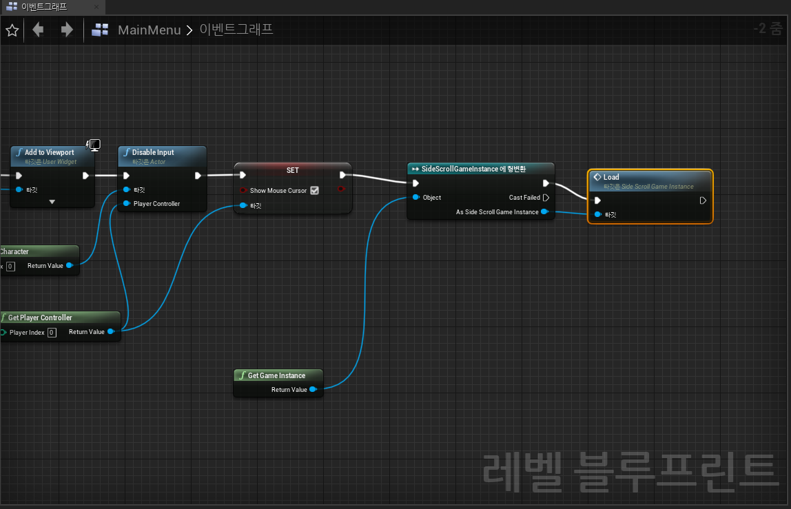 레벨 블루프린트(Main menu)를 열고 SideScrollGameInstance의 Load를 불러오도록 한다.