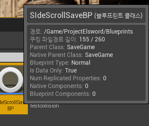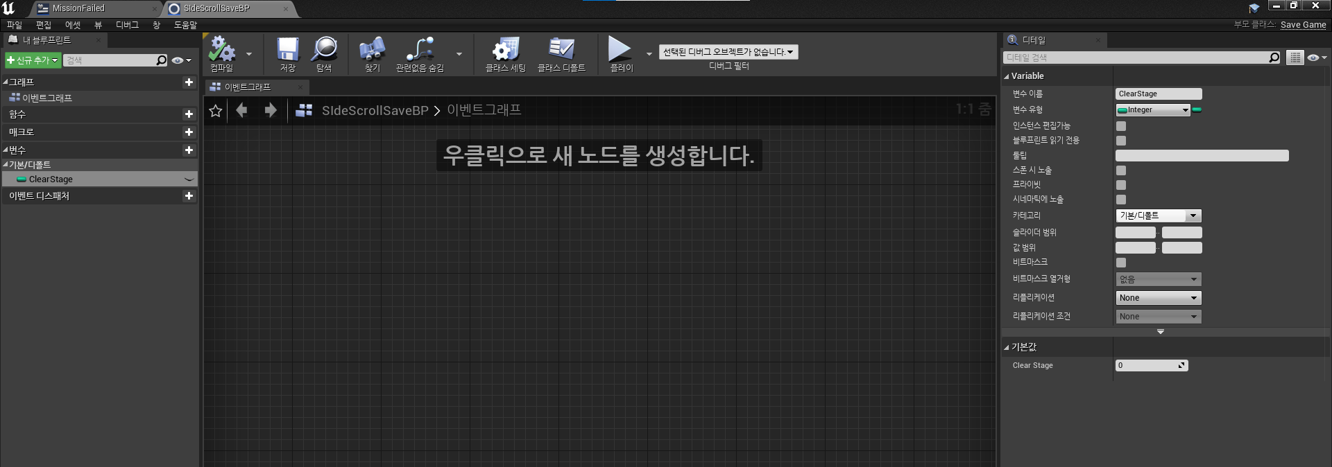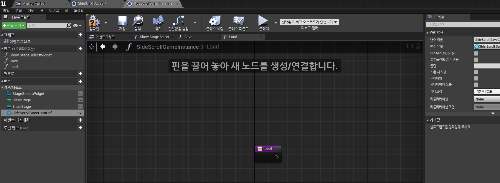SideScrollGameInstance에서 함수 Save, Load 추가, 변수 SideScrollSaveRef를 추가하고 변수 유형은 방금 만든 SideScrollSaveBP로 한다.